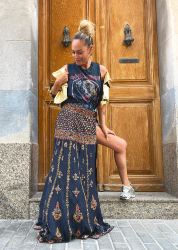 Una prenda versátil y única que se adapta a cualquier estilo. Esta falda mágica, elaborada en algodón 100% con la técnica tradicional block print, es mucho más que una simple falda: su diseño multifunción permite llevarla como vestido, pareo o incluso reinventarla según la ocasión. Su ajuste con tira anudable garantiza comodidad y un fit adaptable a distintos tipos de cuerpo. Frescura, exclusividad y un toque artesanal.